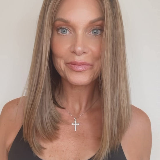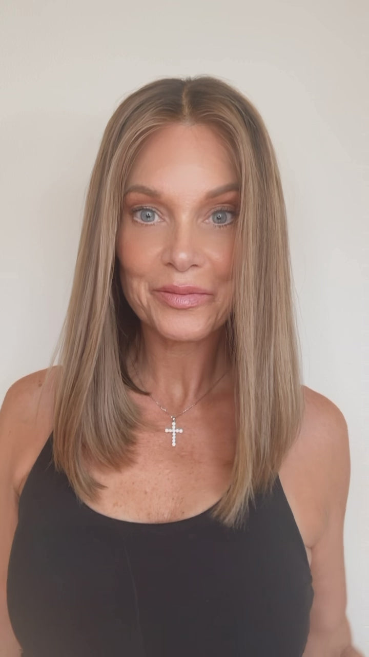 Ashton is a light density, European texture, lace-top human hair wig. Custom colored in a rooted neutral to warm beige brown with golden beige ribbons adding dimension without appearing too brassy. This human hair lace top wig comes double lined with a removable lace liner, to help disguise any bio hair and lightly bleached knots for the most realistic hairline. Ear tabs and removable pressure clips inside cap.