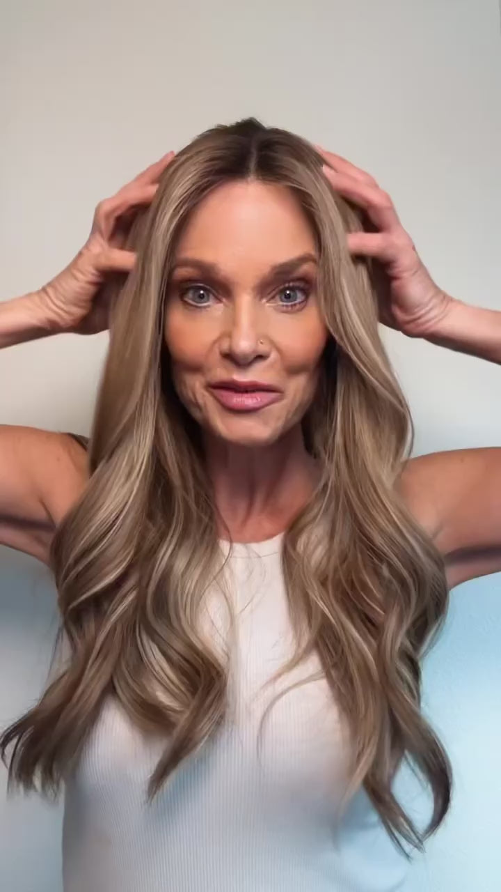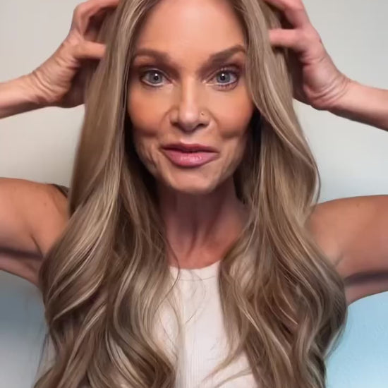 Birdie is a glue-less, ear-to-ear lace premium, lace-top human hair wig. Custom colored a neutral beige brunette level 6, with a soft root melt, creamy beige-blonde highlights, level 8-9, and subtle cool-toned dimension for a smooth, blended, lived-in finish. This European, human hair lace top wig comes double-lined with a removable liner, to help disguise any bio hair. Lightly bleached knots for the most realistic hairline. Ear tabs and removable pressure clips inside cap. This ready-to-wear premium human hair wig is available to ship today in size SMALL ONLY. Color: Neutral beige brunette