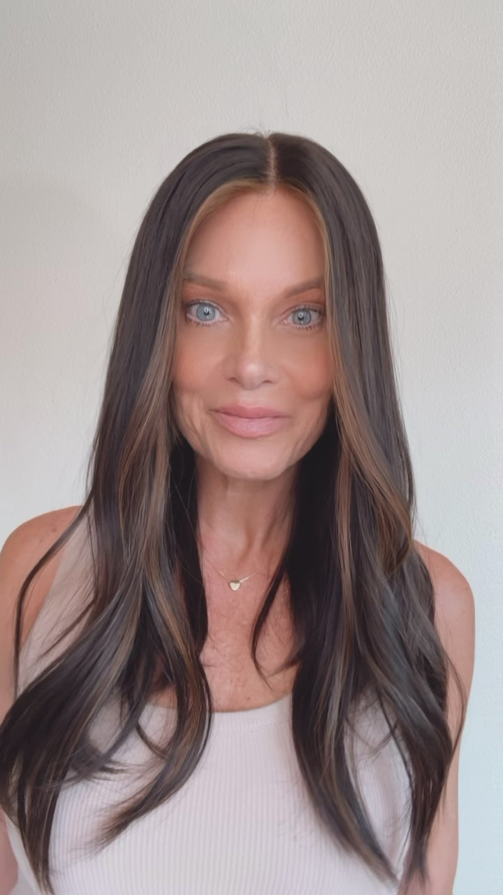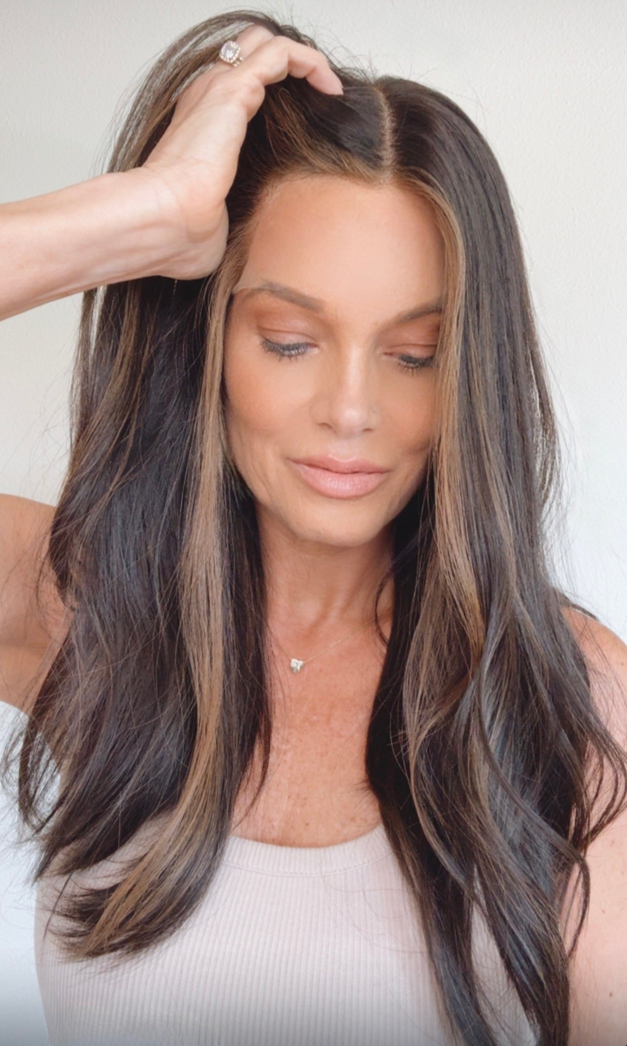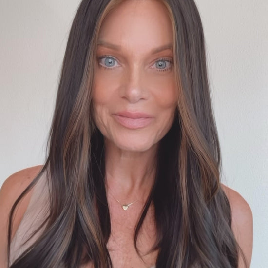 Julienne is a light weight, glue-less, lace-top human hair wig. Custom colored in a deep espresso brunette base with subtle hand painted caramel and golden beige highlights. Double lined removable cap helps disguise any bio hair and/or knots and bleached knots for the most realistic hairline. Ear tabs and removable pressure clips inside cap. This ready-to-wear premium human hair wig is available to ship today in size SMALL ONLY. For additional sizes please see Julienne Preorder.