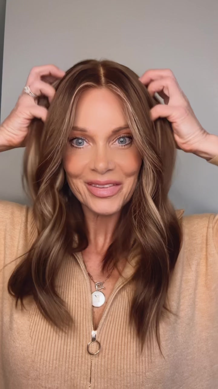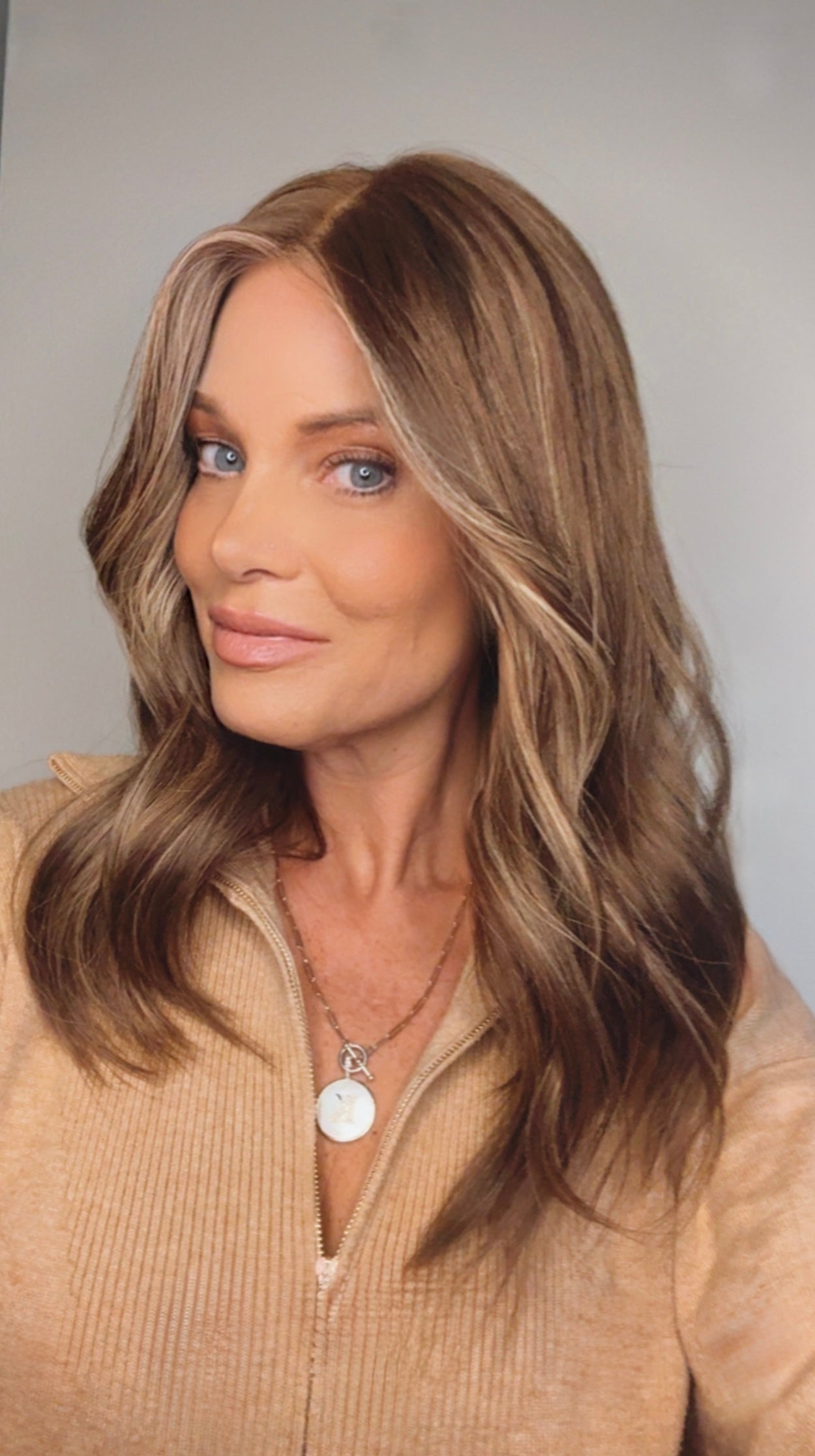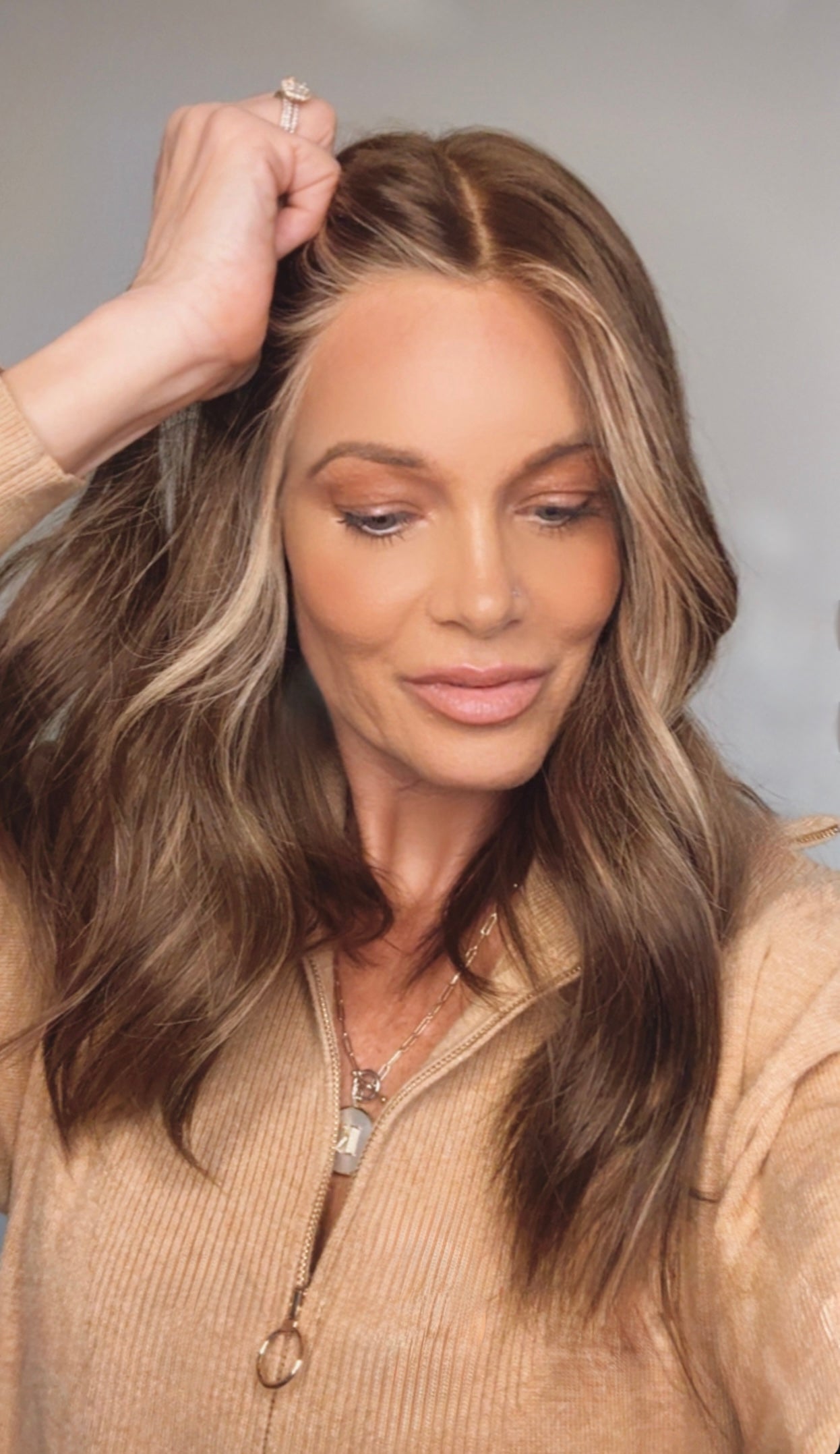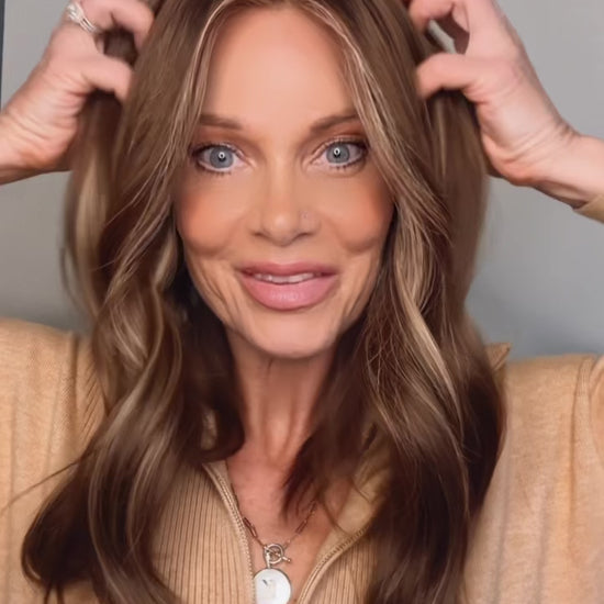 Kenna is a glue-less, ear-to-ear lace premium, lace-top human hair wig. Custom colored in a soft neutral brunette with beige blonde highlights that add a soft creamy glow with cool beige lowlights that keep the tone balanced. Double lined removable cap helps disguise any bio hair and/or knots. and bleached the knots for the most realistic hairline. Ear tabs and removable pressure clips inside cap.