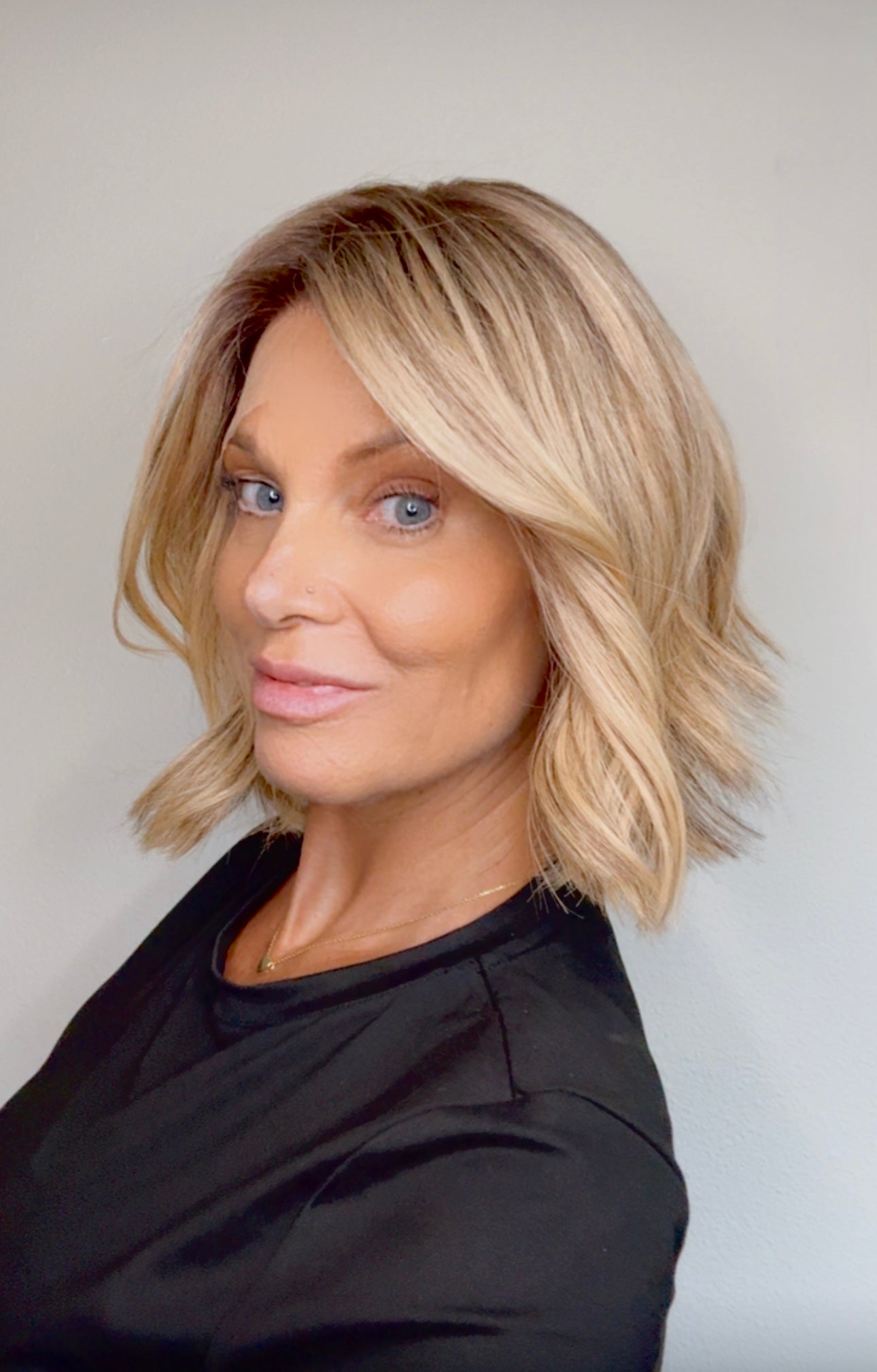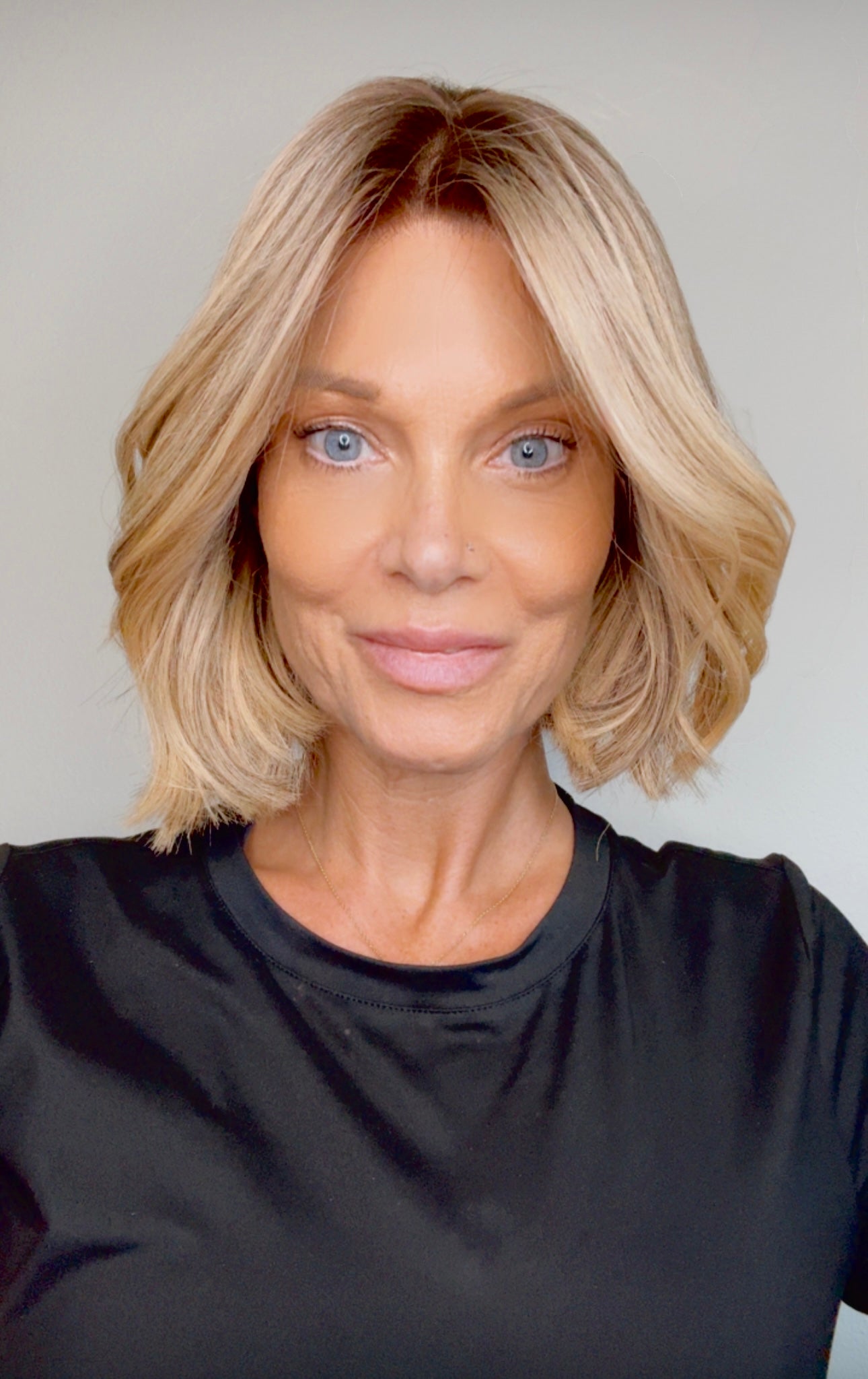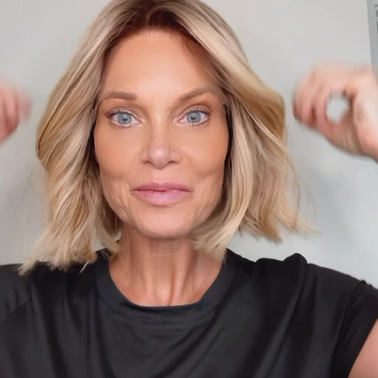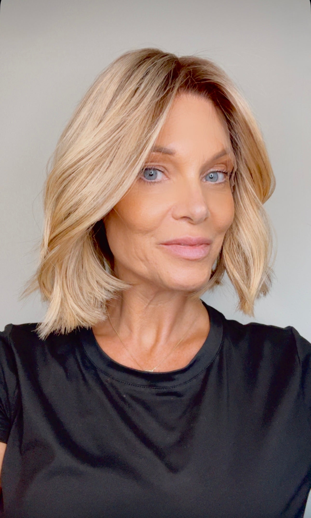 Madeline is a glue-less, ear-to-ear lace premium, lace-top human hair wig. Custom colored in a neutral beige blonde with soft dimension and a medium neutral brown (level 6) root that softly melts into the blonde. Lightly bleached the knots for the most realistic hairline, ear tabs and removable pressure clips inside cap.