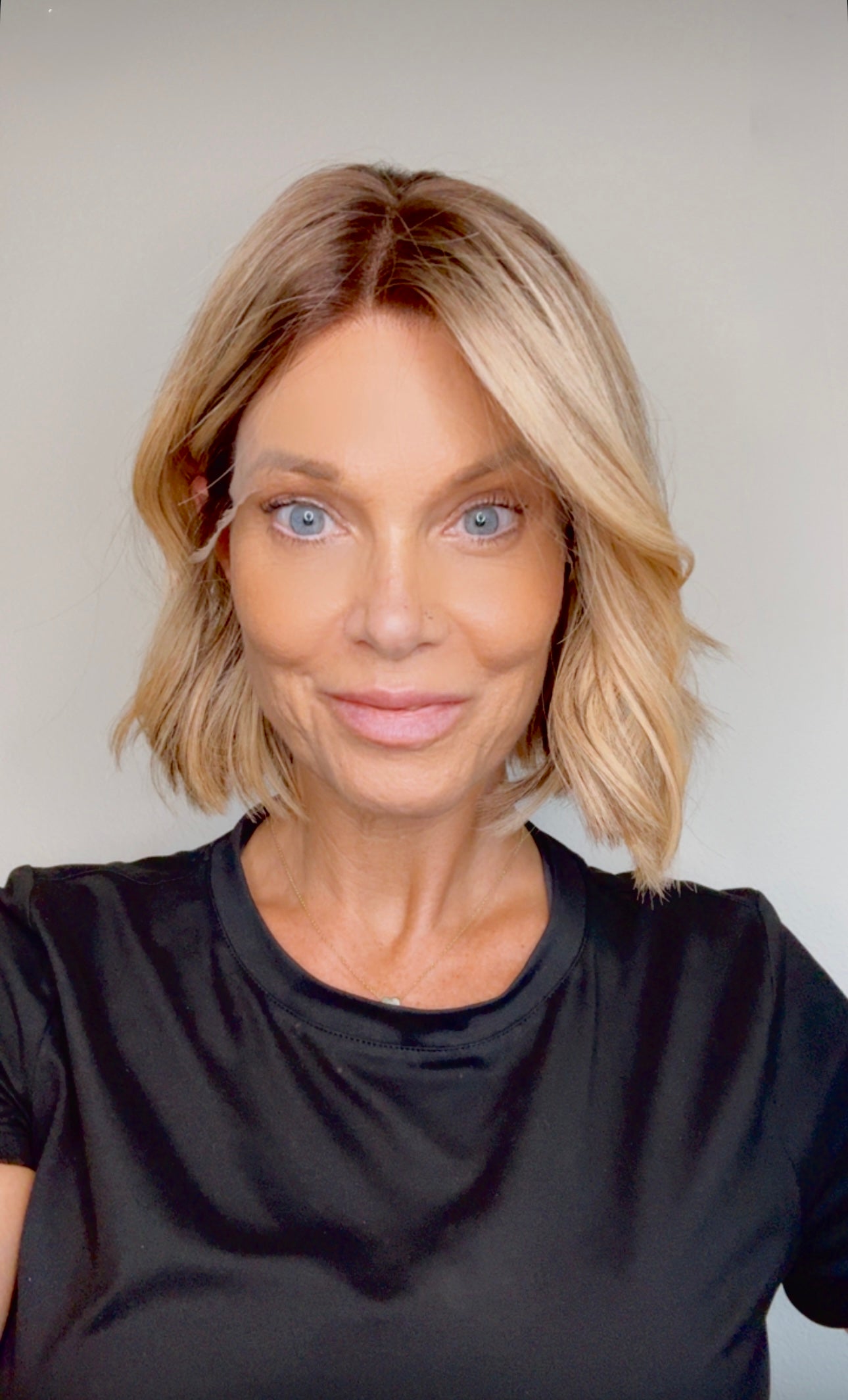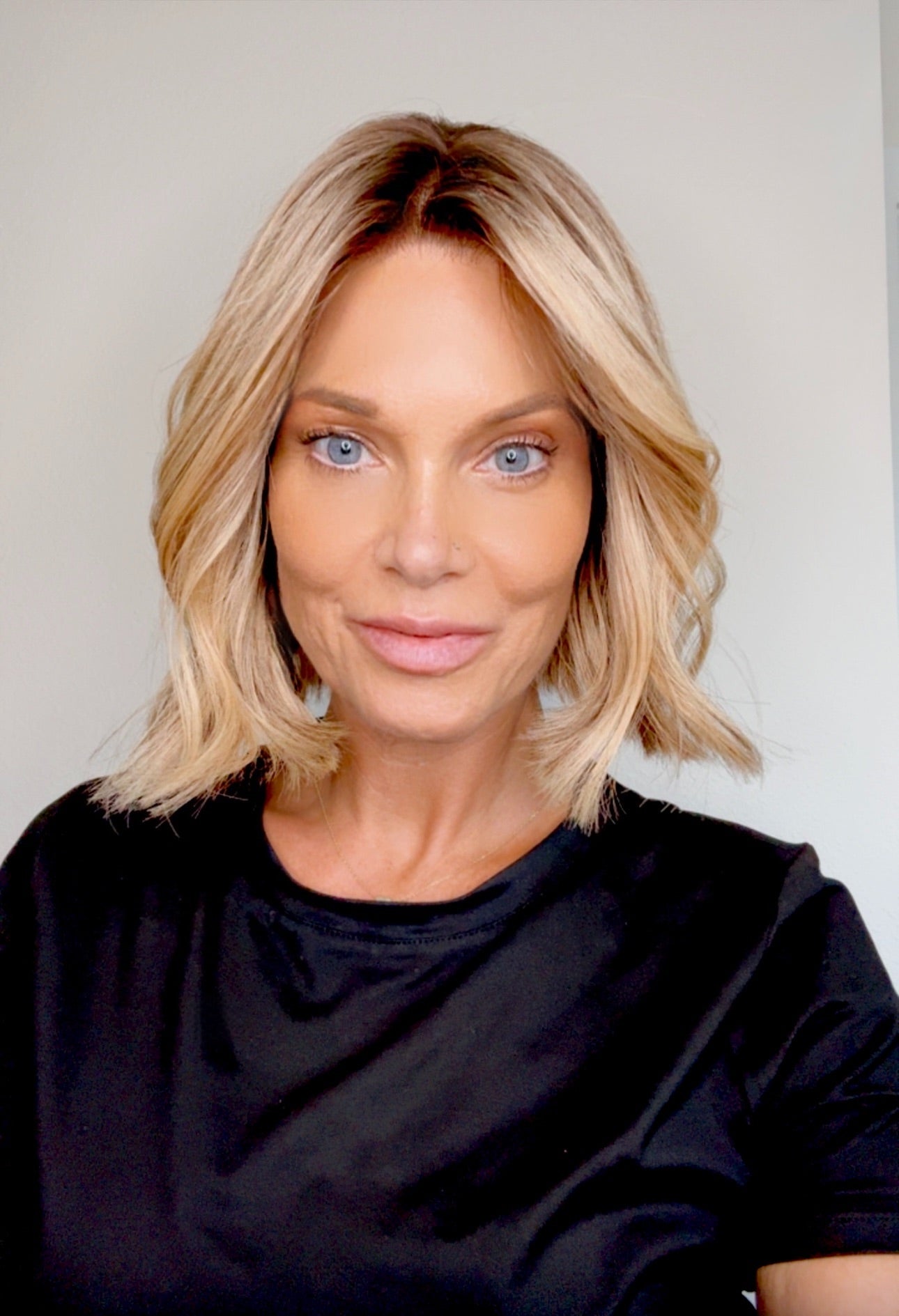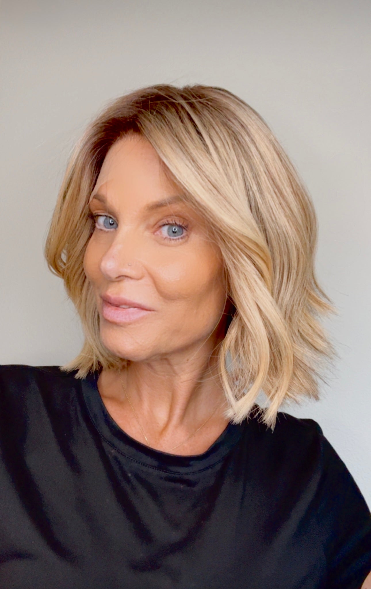 Madeline is a glue-less, ear-to-ear lace premium, lace-top human hair wig. Custom colored in a neutral beige blonde with soft dimension and a medium neutral brown (level 6) root that softly melts into the blonde. Lightly bleached the knots for the most realistic hairline, ear tabs and removable pressure clips inside cap.