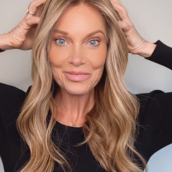 Sadie is a glue-less, ear-to-ear lace premium, lace-top human hair wig. Custom colored in a dimensional warm beige bronde with a medium golden blonde base. Soft ribbons of honey and sandy blonde highlights throughout. This human hair lace top wig comes double lined with a removable lace liner, to help disguise any bio hair and knots. Lightly bleached knots for the most realistic hairline. Ear tabs and removable pressure clips inside cap.. This ready-to-wear premium human hair wig is available to ship today in size SMALL ONLY. For additional sizes please see Sadie Preorder.