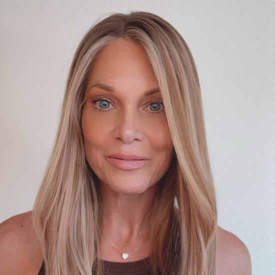 Scottie is a glue-less, low density, ear-to-ear lace premium, lace-top human hair wig. Custom colored in a warm, dimensional blonde with facial framing honey and light caramel highlights and soft ash brown lowlights giving natural depth. Double-lined removable cap helps disguise any bio hair and/or knots. Lightly bleached knots on the lace for the most realistic hairline. Ear tabs and removable pressure clips inside the cap.
