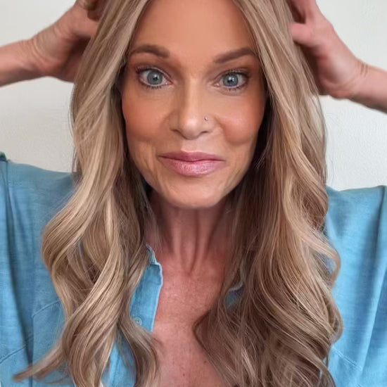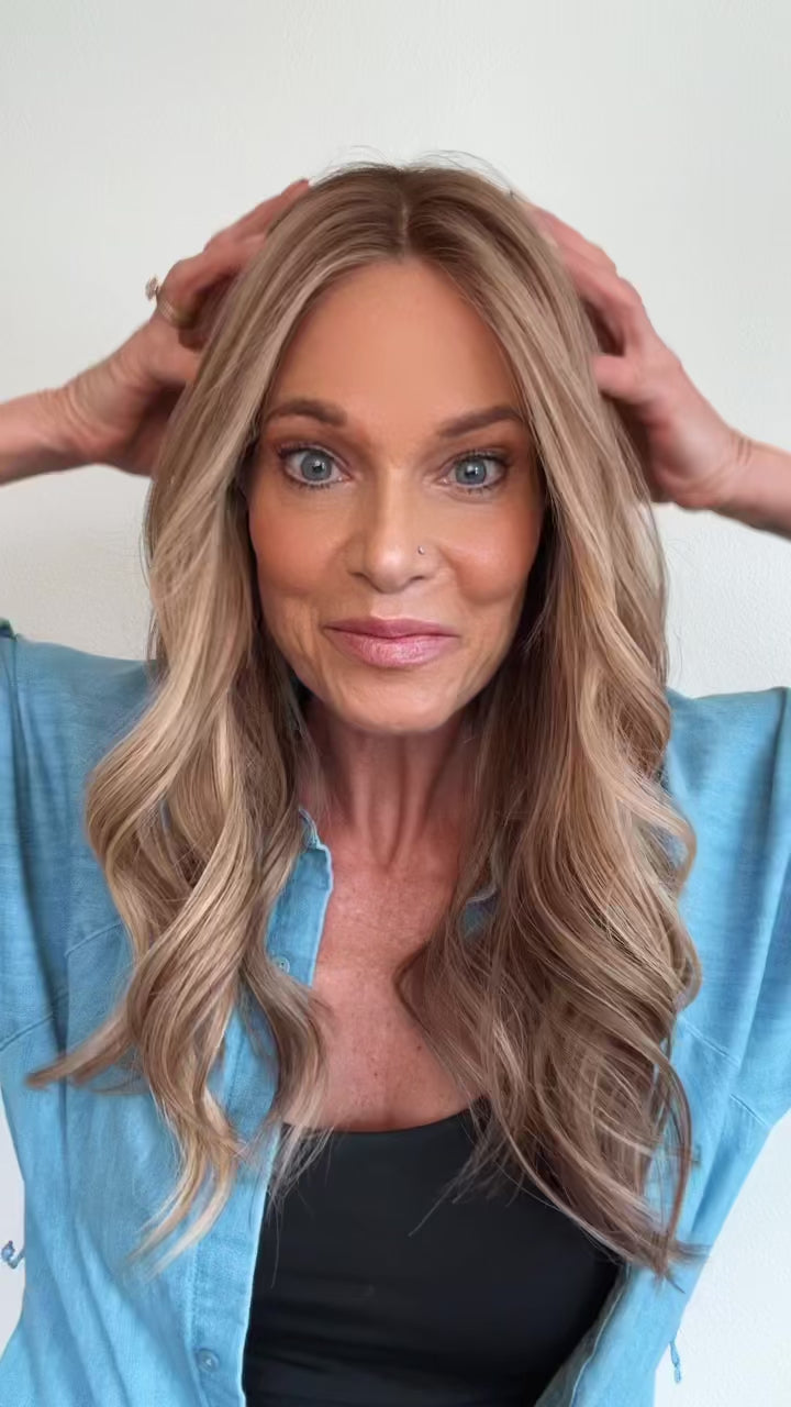 Venice is a glue-less, ear-to-ear lace premium, lace-top human hair wig. A Neutral-warm beige blonde, creamy sandy, soft honey with a touch of champagne. Dimensional but blended. Slightly shadowed root (around a soft level 6/7). This human hair lace top wig comes double lined with a removable liner, to help disguise any bio hair. Lightly bleached knots for the most realistic hairline. Ear tabs and removable pressure clips inside cap. This ready-to-wear premium human hair wig is available to ship today in size SMALL ONLY. Color: Beige Blonde